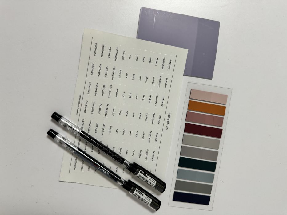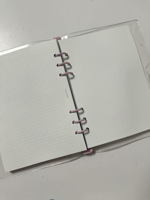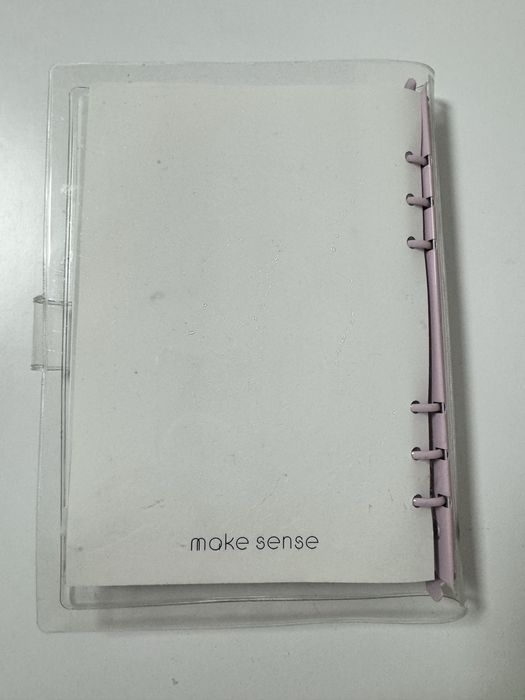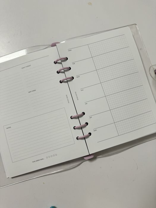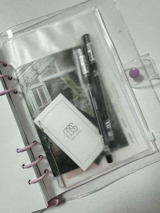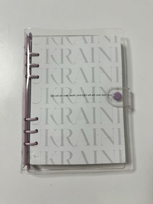Блокнот-конструктор на спіралі. Можна змінювати наповнення. Обкладинка - прозора з фіолетовими кільцями і заклепкою. Входить вже два набори сторінок (на фото). Також є силіконовий прозорий конверт, в якому є закладки, дві чорні ручки, прозорі стікери для нотаток, а також стікерпак з назвами тижнів.
