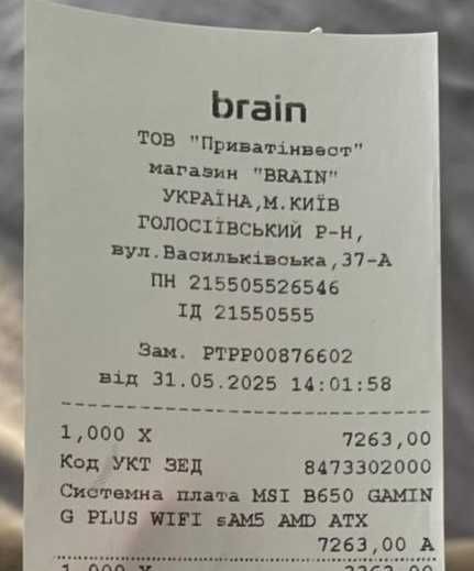 Материнська плата куплена в магазині Brain 31.05.2025 року. Повна комплектація. Гарантія від виробника 36 міс. Тільки зараз завершилась збірка і з'ясувалося, що наявна несумісність з відеокартою XFX Radeon RX 7800 XT Speedster MERC 319 BLACK Edition. Материнку замінили, тому ця на продаж.