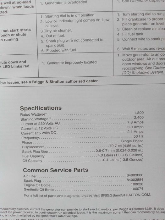В інверторному генераторі Briggs & Stratton P2400 є 2 побутові розетки на 230 В, одне гніздо для зарядки на 12 В постійного струму та два USB-порти на 5 В.