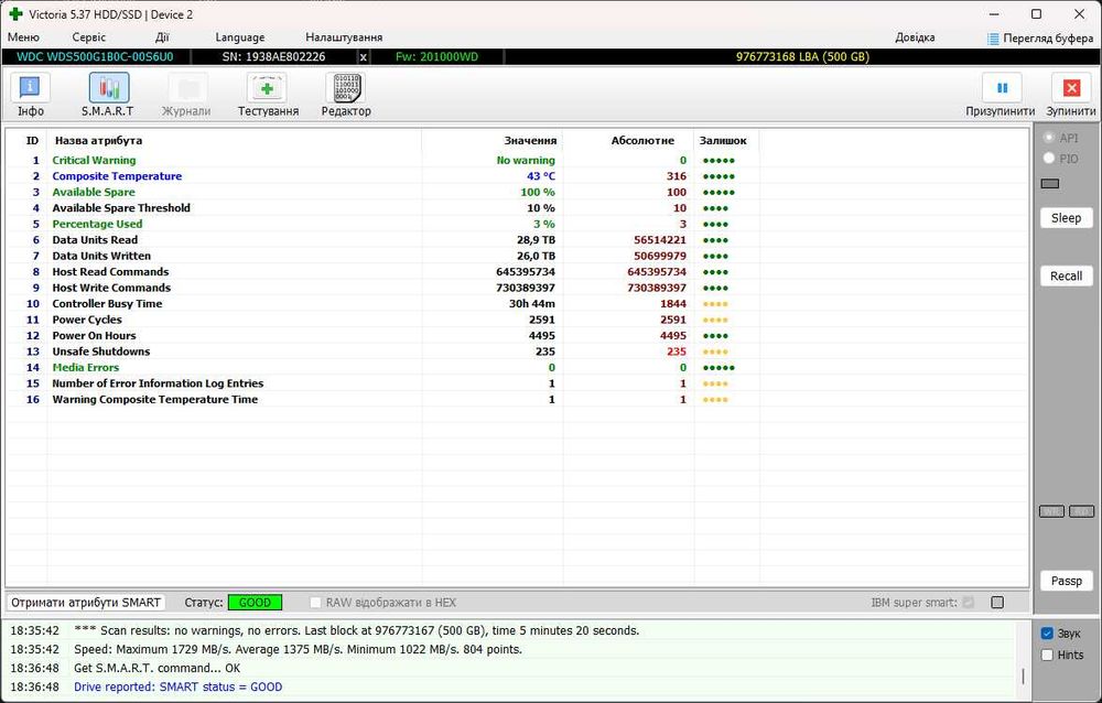 SSD залишився зі старого ПК, куплений у лютому 2020 року. Скріни з Victoria додаю. Безпроблемний SSD.