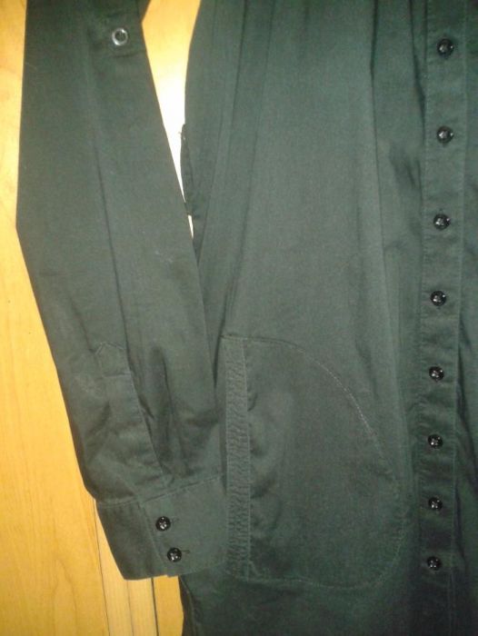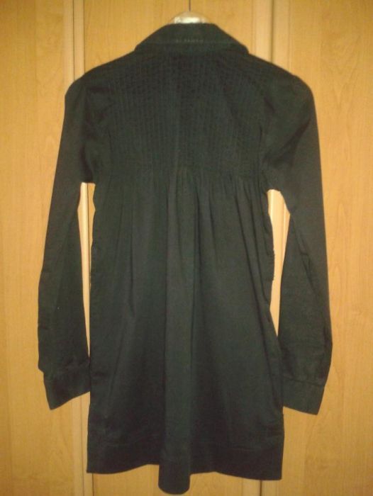 Стильная фирменная рубашка, прекрасно скрывает животик. Состояние очень хорошее, без пятен, дыр и т.д. В комплекте идет пояс резинка. Интересный пошив, рукав можно сделать 3/4. Ткань: 73 % хлопок, 23 % нейлон, 4 % спандекс. Замеры: длина 81 см, длина рукава 62,5 см, плечи 38 см, ПОГ 48 см, ПОТ (линия талии завышена) 49 см, ПОБ 54,5 см. Нюансы: с внутренней стороны пояса потрескался кожзам, но сверху это не заметно; местами цвет не такой насыщенный, так как ткань хлопковая.
