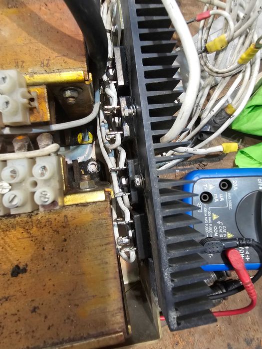 2 трансформатора в параллели и 4 диодных моста с радиатором на моторе компрессора написано 58 ампер +контактор и 2 вентилятора это ампер 90 тоесть по 45 ампер гдето ток транса все вместе 2800 грн по идее и на 24 вольта могут переключены быть так как есть установки 24в