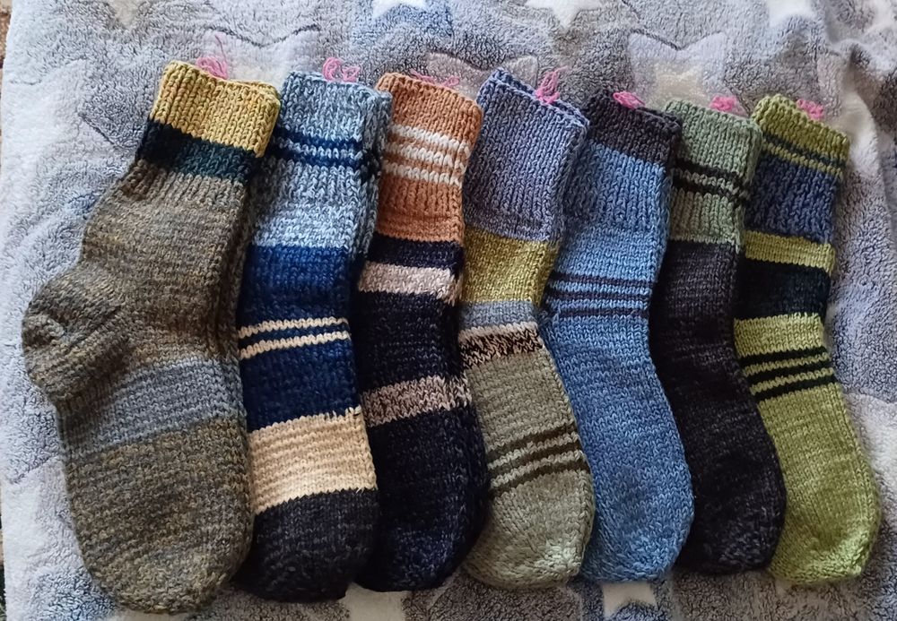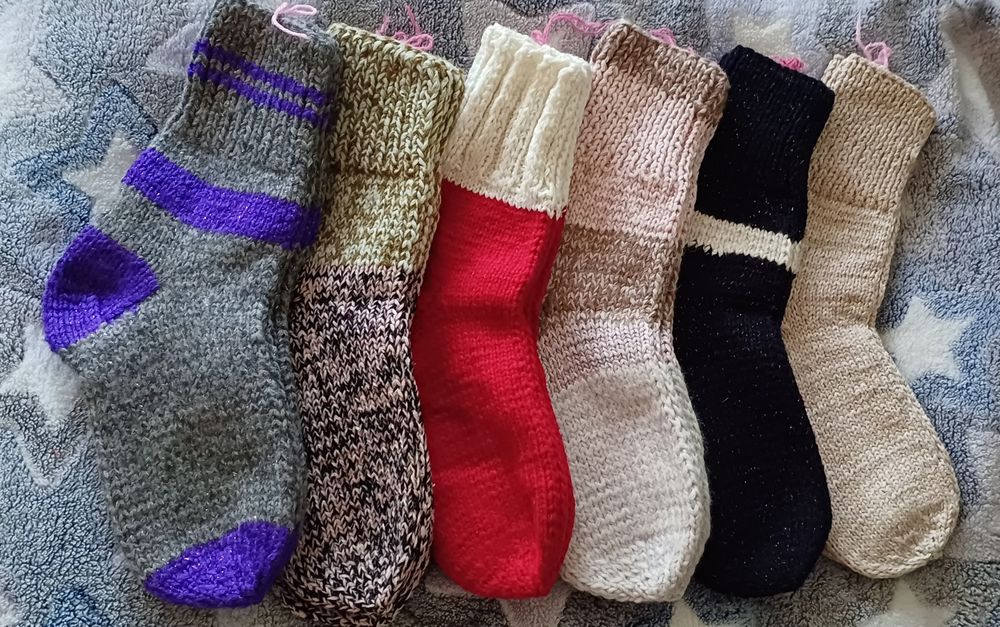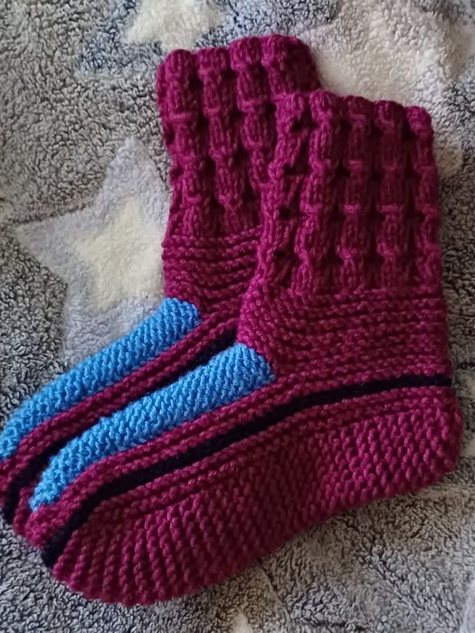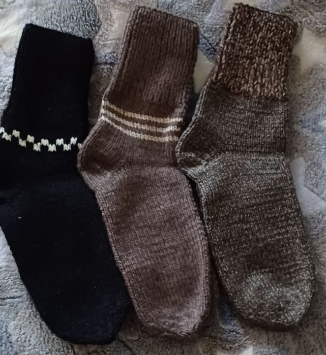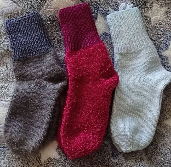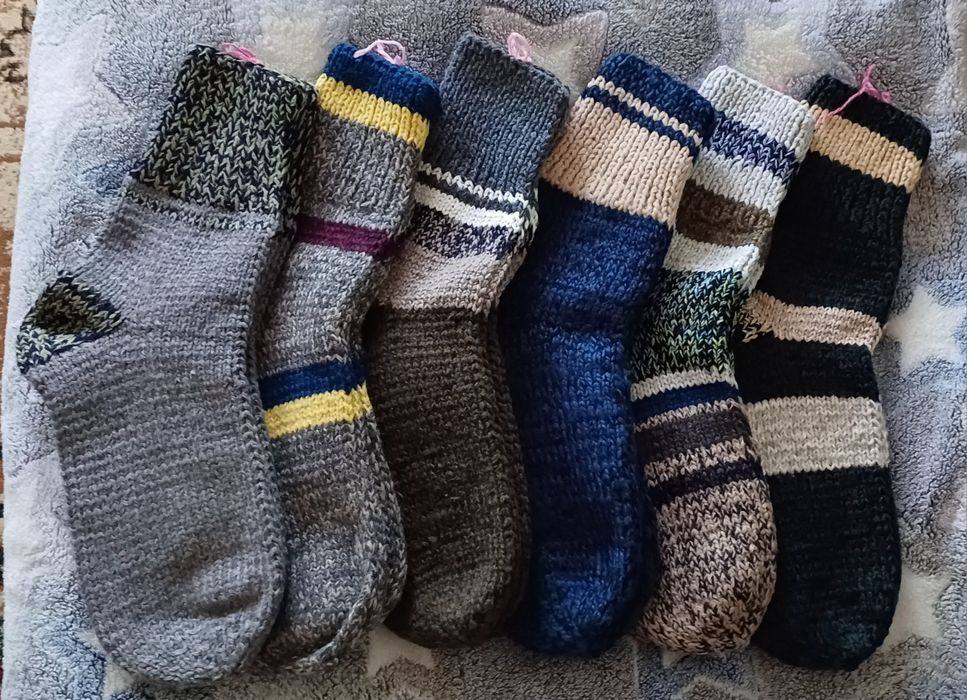 Ручна робота не машинкою в'язані. Різні розміри, різні кольори, ( але уточнюйте за кольори бо можуть попередньо вже купити). Є маленькі шкарпетки, чопи у вигляді тапатуль для кімнати. Ціни залежать від розміру та товщини, пишіть уточнюйте. Товсті дорослі 250грн, Чопапи 200грн, дитячі від 100, підліток від 120-150 Дорослі чоловічі та жіночі 200грн