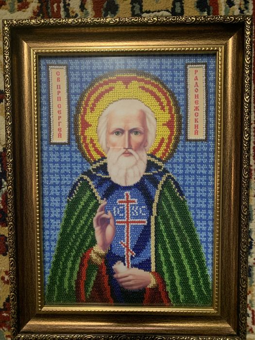 Икона Сергия вышета бисером, в рамке.
