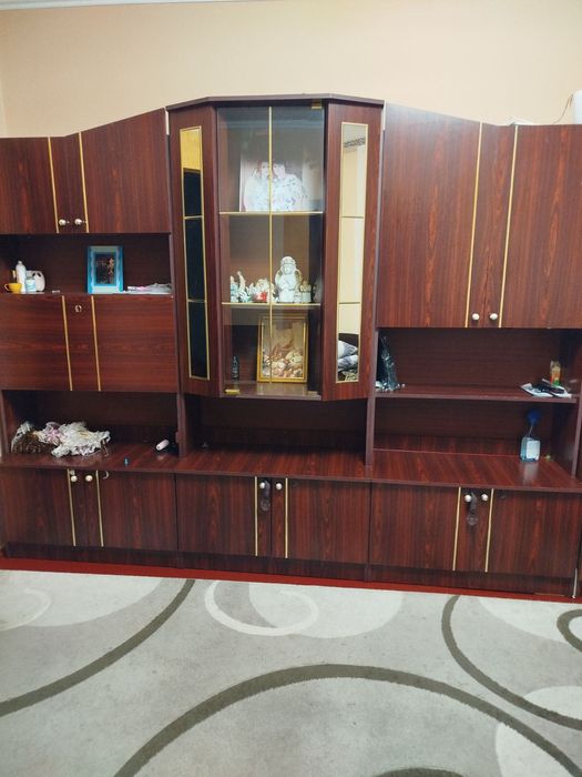 Цей настінний модуль для вітальні має багато відділень для зберігання,дзеркало та скляну вітрину для демонстрації декоративних предметів. Меблі в доброму стані, але мають ознаки використання. Підходить для облаштування вітальні.
