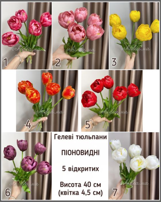 Гелеві піоновидні та махрові тюльпани штучні, квіти латексні  і гелеві
