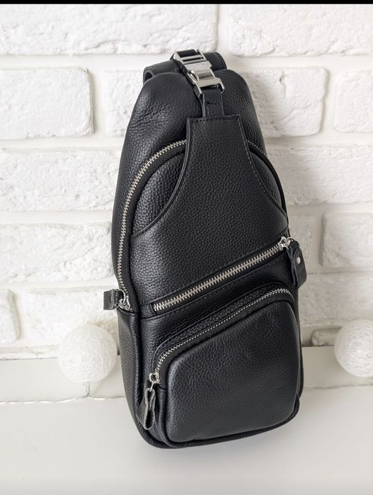 Якісна чоловіча шкіряна сумка слінг чорна, сумка-ранець