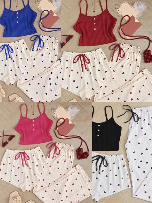 Стильна жіноча піжама-трійка з сердечками /Комплект жіночої піжами у 4 кольорах: рожевому, червоному, синьому та чорному. Комплект-трійка
