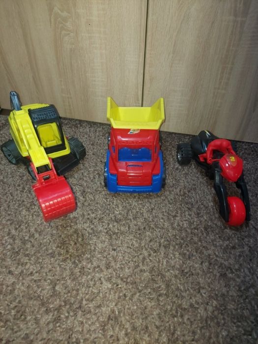 екскаватор, вантажівка, мотоцикліст